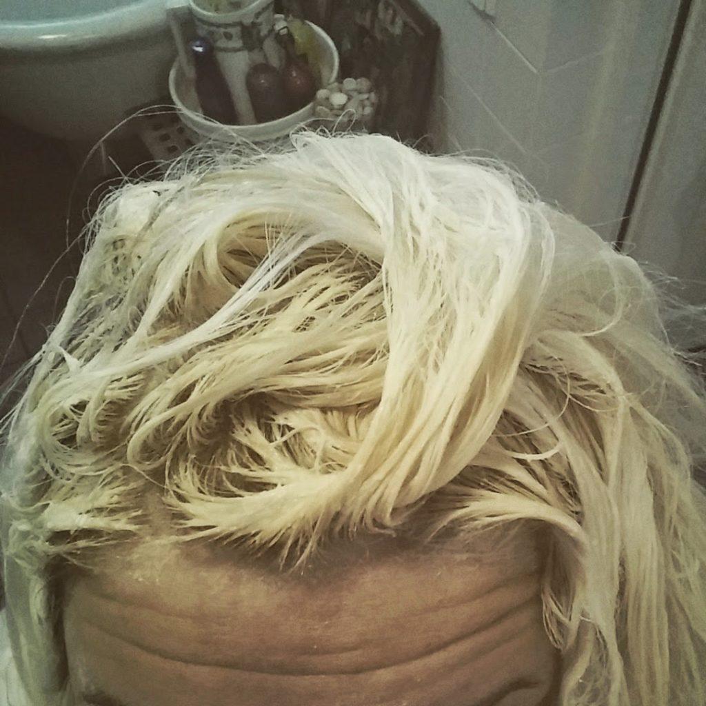 Sen verran paineita kuitenkin otin tästä pikkuserkkutapaamisesta, vielä emme ole ihan niin tuttuja, että olisimme päässeet rönttäpullavaiheen yli. Eli mieli tekisi mennä velourverkkareissa, sillä tänään napa paukkuu, mutta en tiedä tohdinko. Toinen on tämä pissankeltainen tukka… Päätin etten sillä voi lähteä nyt minnekään ja täällä korjausliike meneillään. Tuleeko pisuperoksidi vai mikä tulee. Tiedän joka tapauksessa, että ei tästä taaskaan hyvä tule ja se johtuu jostain keski-iän tuomasta harmaapigmentistä. Hiukseni ovat lopullisesti villaantuneet ja vaikka kuinka vaalentaisi väriskaala on pisu, pisu ja pisu…
