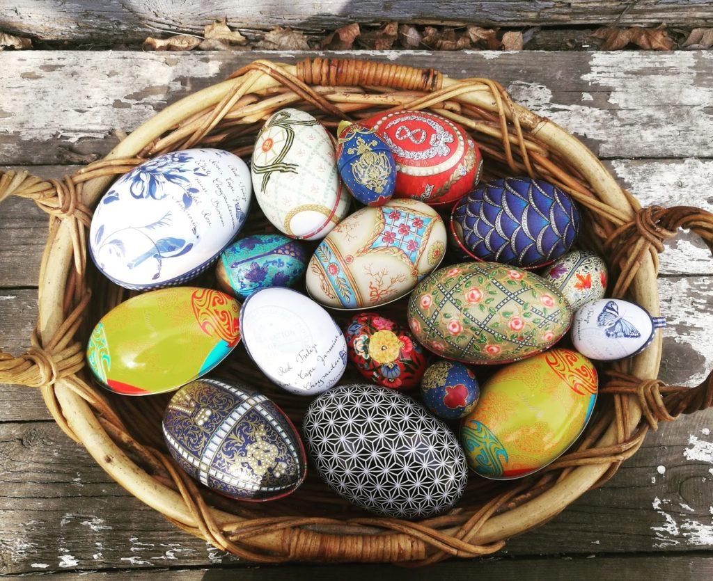 On melkein kaikki nuo munat peltisiä. Siellä on muutama keskikokoinen, jotka ovat puuta, kolme sellaista. Noissa peltisissä on todella herkkuja sisällä. rakastan💚💚💚 Kinder suklaa on tosi hyvää kyllä ihanaa pääsiäistä!💖💖