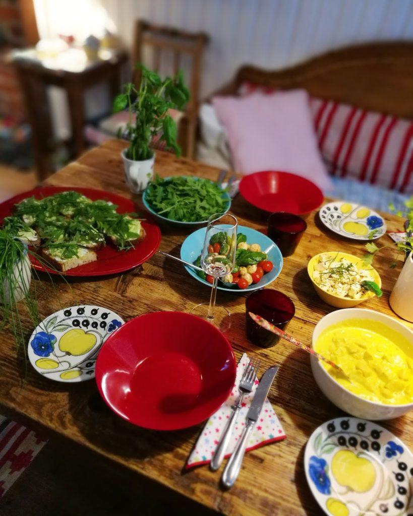 Noh joka tapauksessa, kaikesta lumesta, sateesta, rännästä ja harmaudesta huolimatta tai juurikin siksi, eilen teki hurjasti mieli sitruunaisia piristäviä ruokia ja kattauksessa runsaita värejä. Väreistä saa voimaa läpi tuulen ja tuiskun.