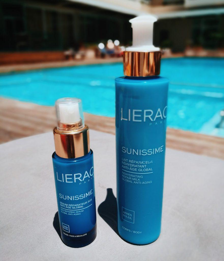 Käytössä reissun aikana oli myös vasemmalla oleva Korjaava, rauhoittava ja kosteuttava after sun seerumi kasvoille. Lierac Sunissime SOS Repairing Serum After sun seerumin sisältämä taikapähkinäuute ennaltaehkäisee ikääntymisen merkkien syntymistä. Seerumin ihoa rauhoittava koostumus sisältää optimaalisen määrän avokadoöljyä ja runsaasti omega-3- ja omega-9-rasvahappoja, jotka hellivät auringossa kuumentunutta ja kosteuttaan menettänyttä ihoa. Seerumin älykäs Cryo Effect -teknologian sisältävä koostumus laskee ihon lämpötilaa ja lieventää ylikuumenemisen tunnetta.