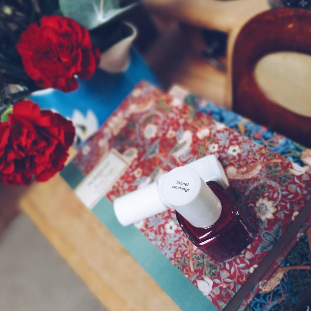 Tarvitset mielellään base coatia, käytin essien base coatia. Kaksi kerrosta kynsilakkaa ja käytin essien klassisen punaista ja itse ostamastani essie joulukalenterista tullutta sävyä ”fishnet stockins”. Päälle laitoin ”speed setteriä”, joka kuivattaa kynsilakan ja vielä päälle essien gel top coatia, joka on avain kaikkeen. Gel top coat antaa kauniin kiillon ja saa kynsilakan pysymään ja pysymään. Olen kynsillä tiskannut, suihkinut, ottanut tarralappuja irti tuotteista ja vaikka mitä ja silti kynsilakat ovat vain aavistuksen, mutta ei edes huomattavasti kuluneet päistä ja pikemminkin kynnet ovat kasvaneet ja siitä ehkä joku tarkkanäköinen voisi huomata, ettei ole eiliset kynsilakat kyseessä.
