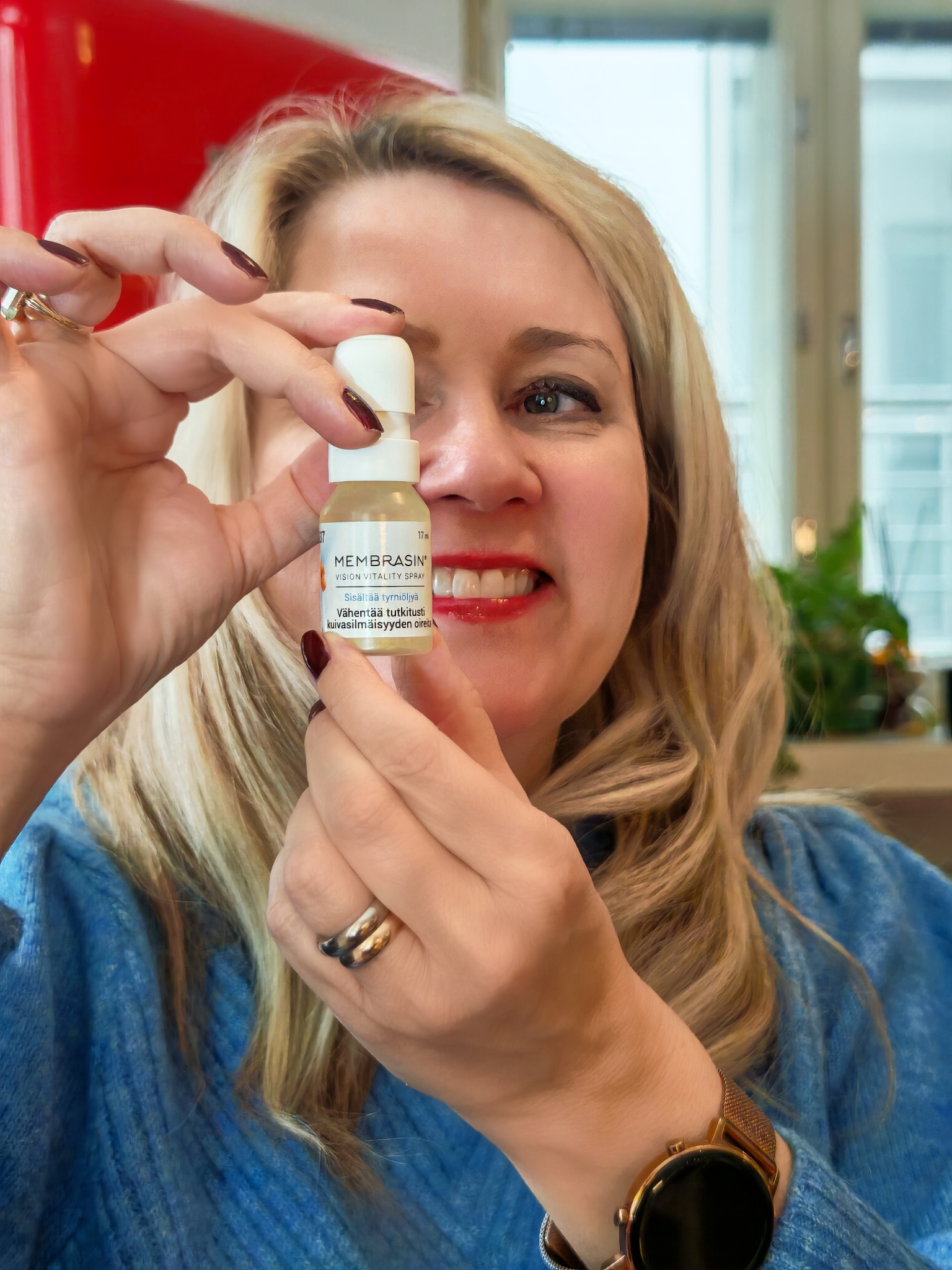 Apua silmien kuivuteen saat Membrasin Vision Tyrniöljy-Luteiini-Zeaksantiinitabletilla ja tähän vielä lisänä suihke kuiville silmille eli Vision Vitality Spray, joka myös sisältää tyrniöljyä.