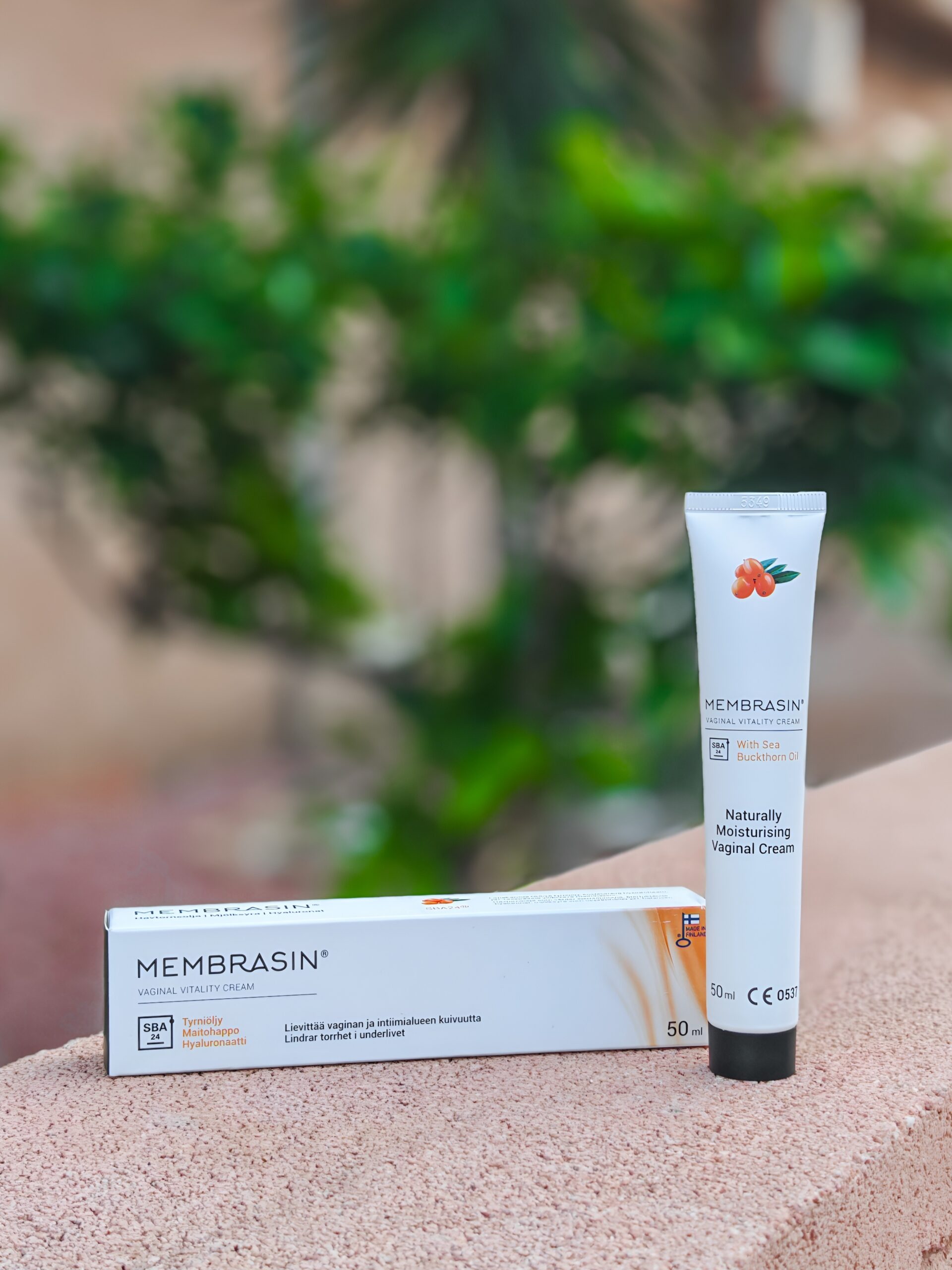 Suomessa valmistetun 2-vaiheisen Membrasin Moisture -sarjan ravintolisän ja intiimivoiteen avulla saanut helpotusta kuivuuteen ja kutinaan. Vaginal Vitality Cream eli intiimialueen voide, joka sisältää tyrniöljyä, maitohappoa ja hyaluronaattia. Tässä vaihdevuosiin liittyvää kirjaa kirjoittaessa, olen oppinut myös ymmärtämään, mitkä aineosat ovat tärkeitä intiimialueiden hyvinvointiin, kuten maitohappo.