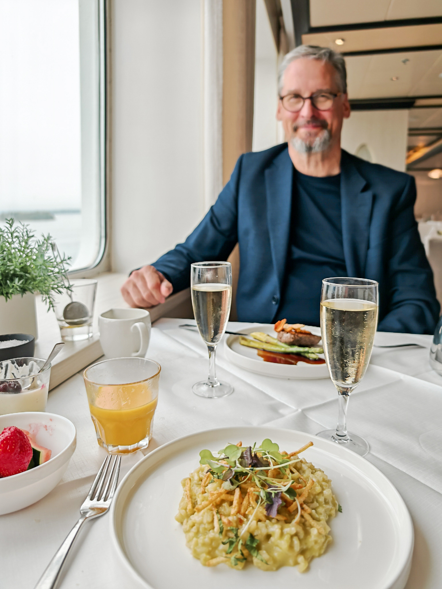 Ihastellen ikkunoista Tukholman saaristoa ja nauttien kiireettömästä brunssista, joka tuodaan pöytään ja sisältää myös lämpimän ruoan. Erikoiskahvit ja kuohuva kuuluu aamiaiselle. Nautimme alkoholitonta kuohuvaa ja oli hyvää.