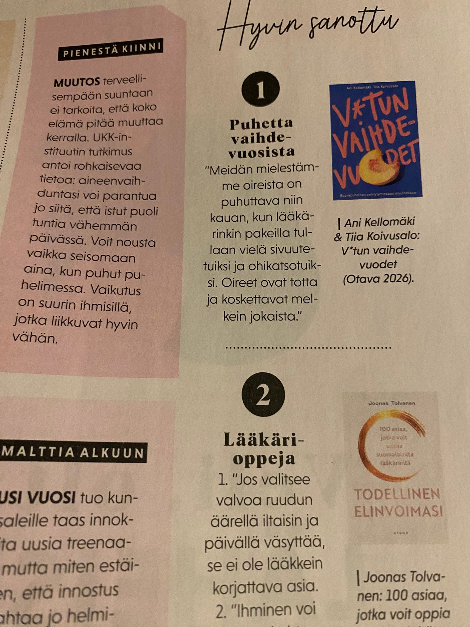 Parasta meille kuitenkin on ollut teidän lukijoiden palaute, joka on ollut mieletöntä. Tänään sain esimerkiksi viestin, että kirja oli kuin halaus. Kirjan tarkoitus on edesauttaa tietoisuutta vaihdevuosissa, jotta naiset saisivat tulevaisuudessa parempaa ja tasa-arvoisempaa hoitoa. Vaihdevuosista kärsivä nainen koskettaa koko yhteiskuntaa ja olemme jonkun äitejä, ystäviä, puolisoita, tyttäriä, työkavereita jne.