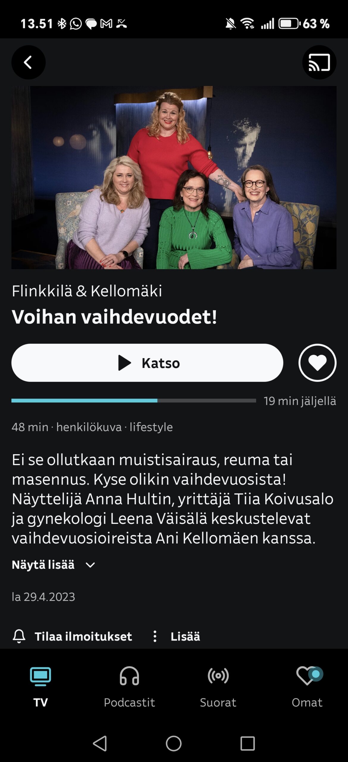 Jos on aikaa, kannattaa katsoa Flinkkilä & Kellomäki ohjelman jakso ”Voihan vaihdevuodet”, jossa esiintyvät myös Gyne Leena, vaihdevuosien sanansaattaja ja näyttelijä Anna Hultin, jonka aivan mieletön vaihdevuosinäytelmä ”Är dett här?” on taas ajankohtainen. On suomen kielinen tekstitys. Kävimme Anin kanssa katsomassa Annan näytelmän ja itkimme ja nauroimme monet kerrat. Pohdimme myös, että jos olisimme nähneet tämän näytelmän ennen kuin tiesimme itse mikä meitä riivasi, olisi Annan näytelmä valaissut meitä suunnattomasti vaihdevuosien saralla.