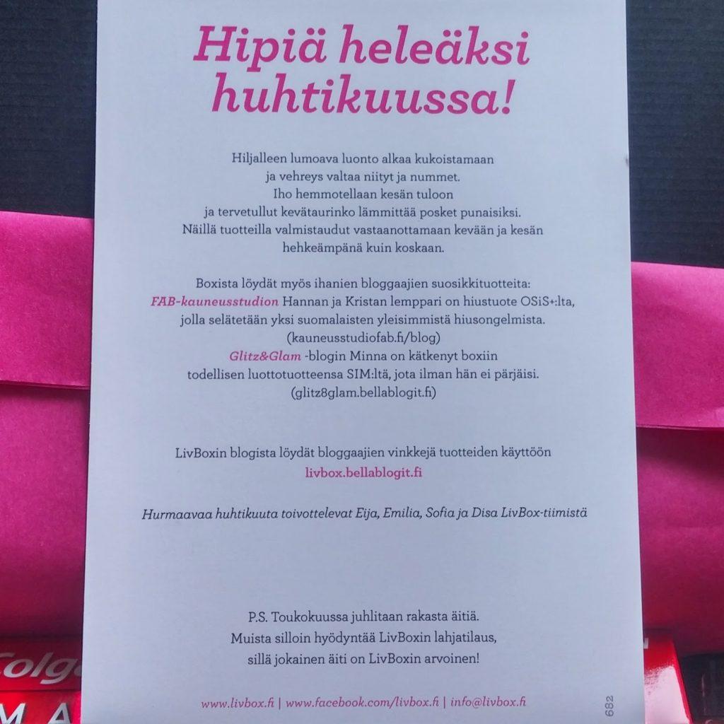 Livboxilla on muuten aivan kerrassaan mahtava asiakaspalvelu. Olen monet jutut udellut koskien tilauksia tai tuotteita kirjoittamalla Livbox tiimille Facebookin kautta ja olen aina saanut vastauksen viipymättä ja vielä ihanan aurinkoisessa hengessä. Eli Livboxista minulla on enemmän kuin hyvät muistot ja koko sydämestäni suosittelen kaikille kosmetiikkahöperöille omaa Livbox tilausta. Äitienpäiväkin on tulossa eli tässhän on loistava äitienpäiväideakin.