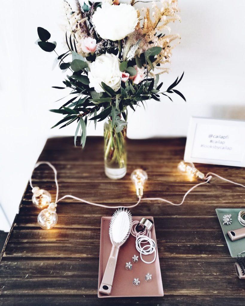 Kiitos Cailapille kaikin puolin lounashetkestä ja siitä, että hetken pääsi arjen yläpuolelle, ihastelemaan kaikkea kaunista, niin itse tilaa, tarjoiluja, kampausten laittoa, upeita kukkakimppuja ja Cailapin uusia hiusharjoja.