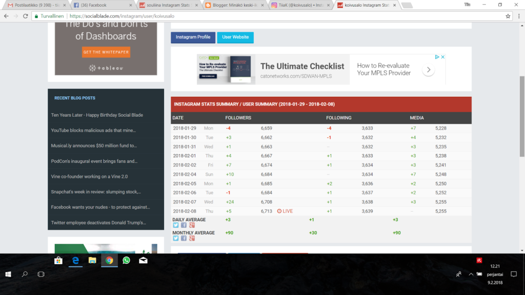 Ohessa statistiikkaa oman Instagram tilin tahmean hitaasta kasvusta. Souliinalle laitoin myös omansa, kun häntäkin asia kiinnosti ja hänellä ihan sama tahmea tahti, kuin Jonnalla ja minulla ja meidän käppyräthän voi käydä kurkistamassa yllä olevista linkeistä boldattuna tai kenen tahansa käppyrät laittamalla kyseisen Instagram tilin nimen Social Blade tilin hakukenttään, valitsemalla Insta osion ja painamalla suurennuslasin kuvaa.