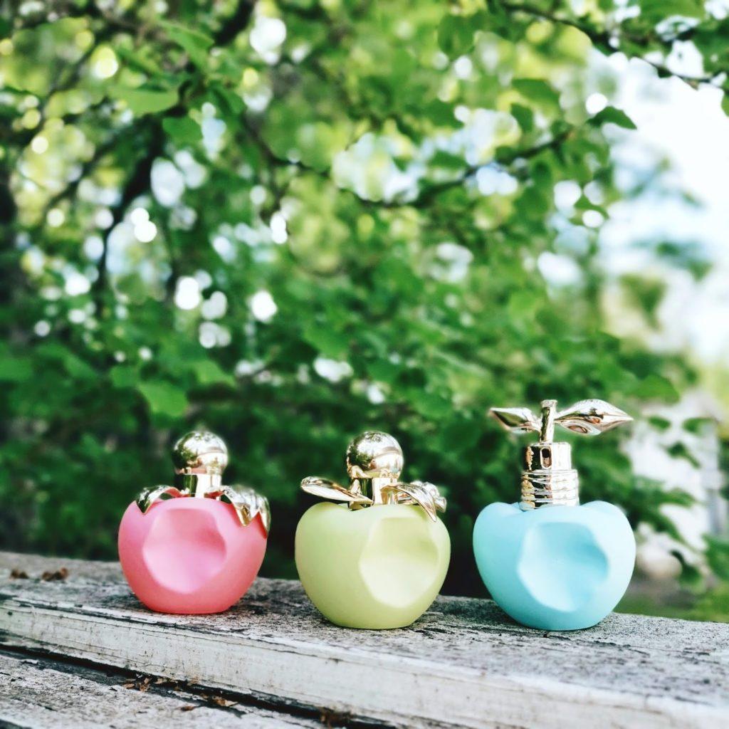 Nina Ricci Les Sorbets de Bella (vihreä) tuoksuu pehmeälle raparperille, Nina (vaaleanpunainen) sitrukselle ja Luna (vaaleansininen) tuoksuu päärynälle. Kaikissa on sorbettimaisen kirpeä, mutta silti jädemäisen pehmeä tuoksu. Ihanimmat Nina Riccin ompputuoksut ikinä ja miten tuoksupullotkin voikin olla noin somia. Kyseessä limited edition kokoelma.
