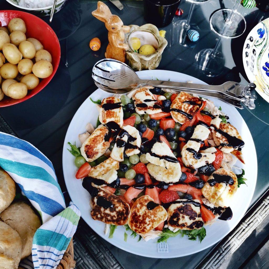 Tarjosimme Entrecote-pihvejä, pikkuisia perunoita, jotka jätin syömättä, kotona leivottuja sämpylöitä, jotka jätin syömättä. Olin tiukkana vaikka mieli olisi niin tehnyt haukkaista uunituoreita sämpylöitä. Mansikkabroilerihalloumsalaattia, aurajuustokastiketta ja valkosipulikastiketta kylkeen.